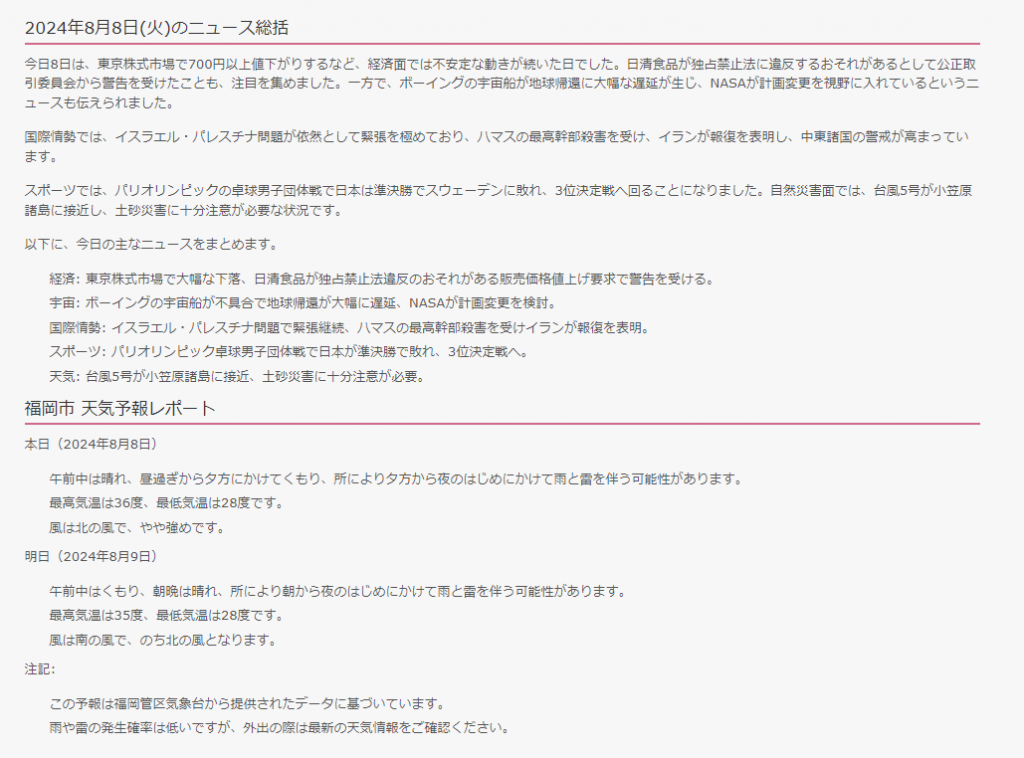 実際の外部向けWebサイトとかに張り付けるには、もう少し仕組みを洗練させたほうがよいでしょうし、記事転載時のお作法とかちゃんと調べたほうが良いかな?と思いますので、そのあたりはきちんと調べるようにしてくださいね。ちなみにローカルLLMに限らずどんなLLMもそうなのですが、決まった形式にびしっとできるかというとそうとは限りません。割と体裁は更新するたびにころころ変わりますし、LLMの注目箇所が変化すれば当然そのまとめ内容も変化します。