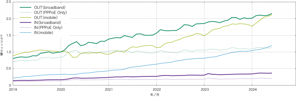 - IIJの固定ブロードバンドサービス全体の月ごとの平均トラフィック量は、2019年6月~2024年6月の5年間で、INは1.72倍、OUTは2.01倍(年率換算で1.11と1.15)でした。
