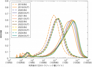 - 2019年から2024年の5年間で、利用者の1日のトラフィック量は、分布の山の頂点に当たる最頻出値でOUTは2.0GBから5.6GBへ2.8倍に、INは89MBから224MBへ2.5倍に増加しています。