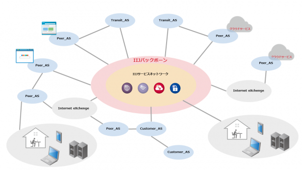 IIJも例に漏れず他ASとトランジット接続やピア接続を行っており、他ASとはIIJのインターネットサービスの基盤となるバックボーンネットワークで接続しています。
